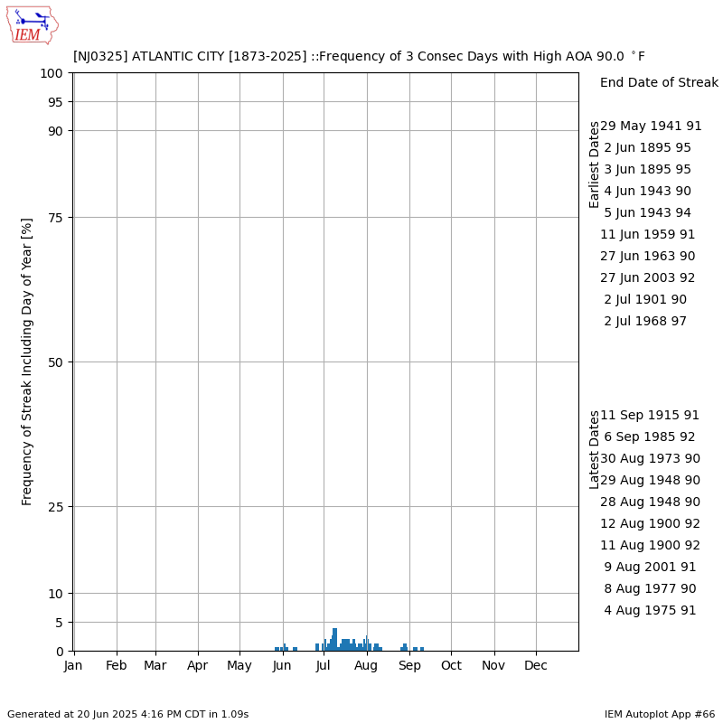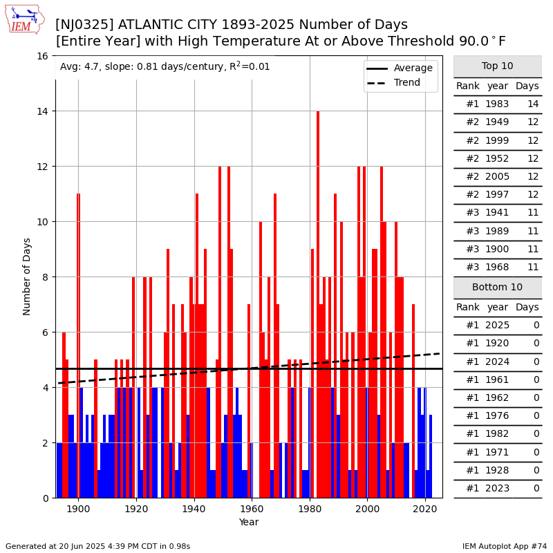 The Sen. Frank S. Farley State Marina in Atlantic City averages 4.4 days a year with a temperature of at least 90 degrees. Using the New Jersey heat wave definition, the last one for the city was July 2011.
