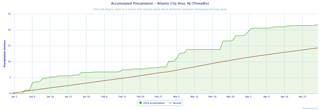 Last year was nearly the opposite. It was the wettest start of the year, on record, through April 25, at Atlantic City International Airport, according to the National Oceanic and Atmospheric Administration. Located on the edge of the Pine Barrens, it’s a good indicator for the South Jersey Pinelands.
