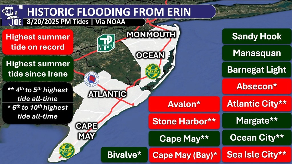 The highest summertime tide since Tropical Storm Irene in 2011 for virtually every other tidal station on the Jersey Shore.